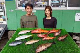 船外機ボートで石田さんがアカハタ、オオモンハタ、カサゴシマアジ、グレをゲット。