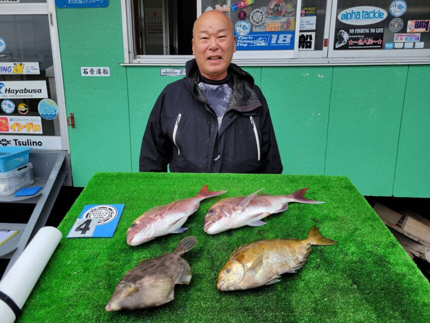船外機ボートで河野さんがマダイ、カワハギ、アイゴをゲット。