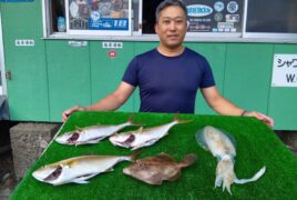 船外機ボートで石島さんがワラサ、オオモンハタ、スミイカをゲット。