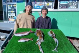 船外機ボートで津森さんがマダイ、アオリイカをゲット。