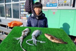 手漕ぎボートではると君がアオリイカ、ノミノクチをゲット。
