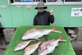 船外機ボートで水越さんがマダイ74㎝までゲット。