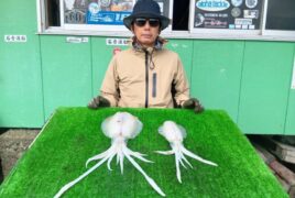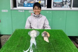 船外機ボートで喜多川さんがアオリイカ&スミイカをゲット。
