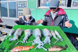 船外機ボートで土橋さんがアオリイカ、オオモンハタをゲット。