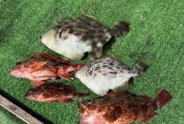 船外機ボートで真木さんがカワハギ、カサゴをゲット。
