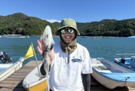 手漕ぎボートでこうし君がカミナリイカをゲット。