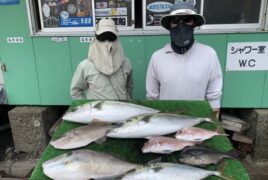 船外機ボートで水野さんがオオモンハタ、ツバスをゲット。