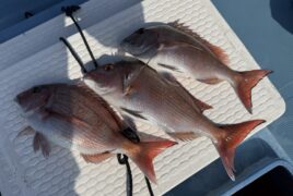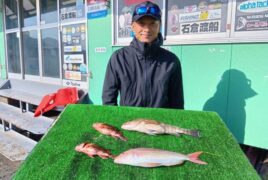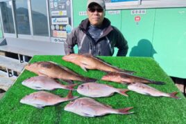 船外機ボートで杉浦さんがマダイ、オオモンハタをゲット。