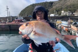 船外機ボートで田中さんがマダイをゲット。
