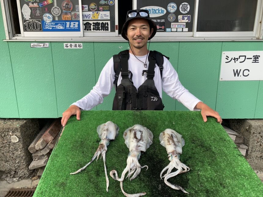 カセ釣りで纐纈さんがアオリイカをゲット。