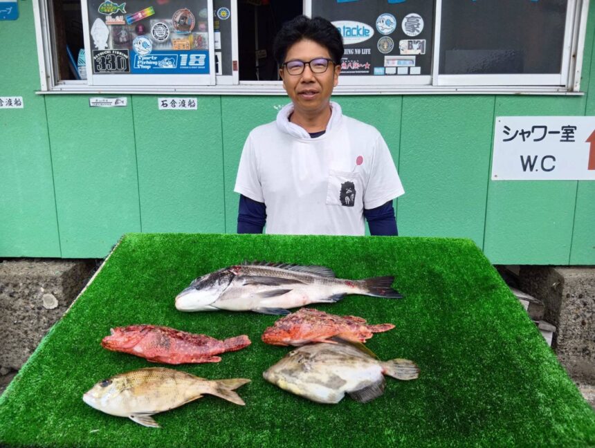 船外機ボートで細川さんがチヌ、メイチ、カワハギ、オコゼをゲット。