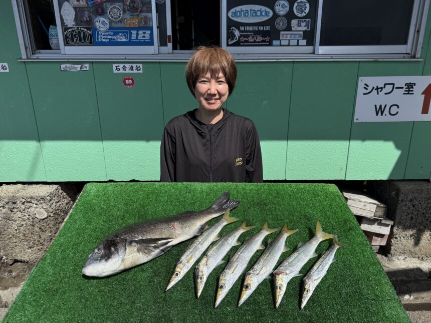 船外機ボートで岡崎さんがシオ、ツバス、オオモンハタ、カワハギをゲット。