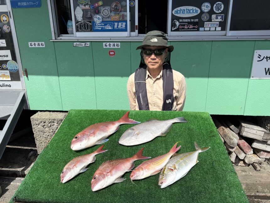 船外機ボートで尾垣さんがマダイ、ウスバハギ、シオ、イトヨリをゲット。