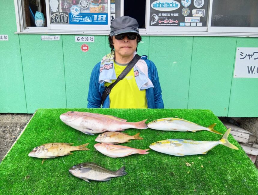 船外機ボートで三宅さんがマダイ、ツバス、メイチをゲット。