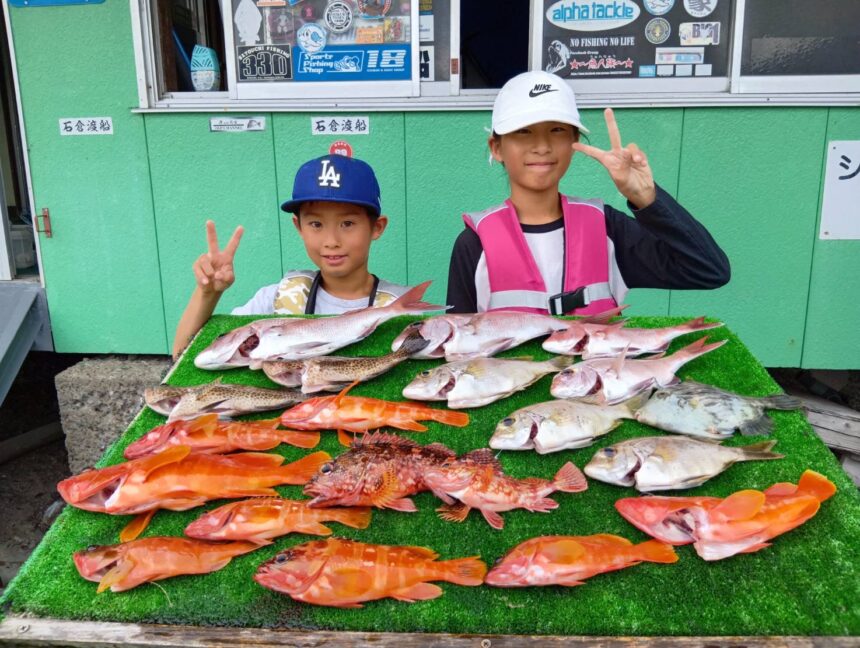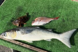 船外機ボートであんずちゃん&さくと君がマダイ、アカハタ、カサゴ、メイチをゲット。