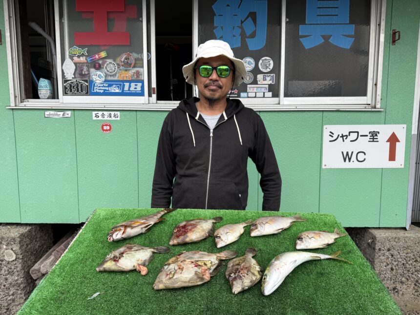 船外機ボートで早川さんがカワハギ、ツバスをゲット。