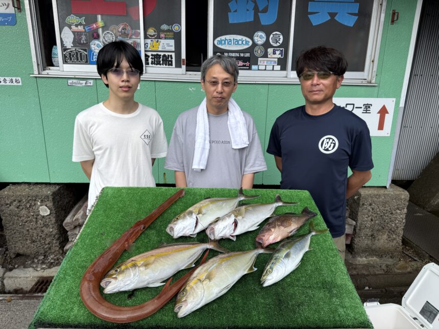 船外機ボートで石島さんがシオ、ツバス、アカヤガラをゲット。