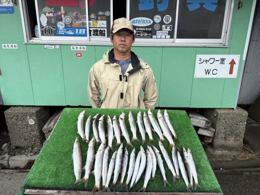 手漕ぎボートで松尾さんがアジ、カマス、オオモンハタをゲット。