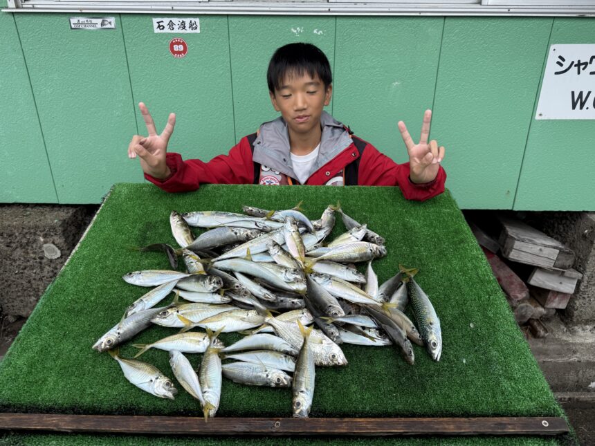 手漕ぎボートであお君がアジをゲット。