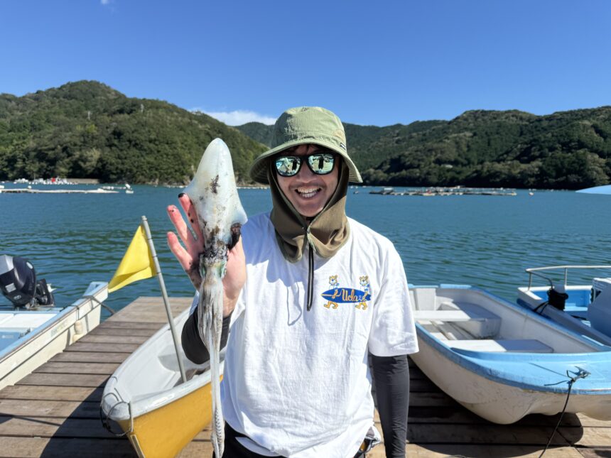 手漕ぎボートで藤田さんがアオリイカをゲット。