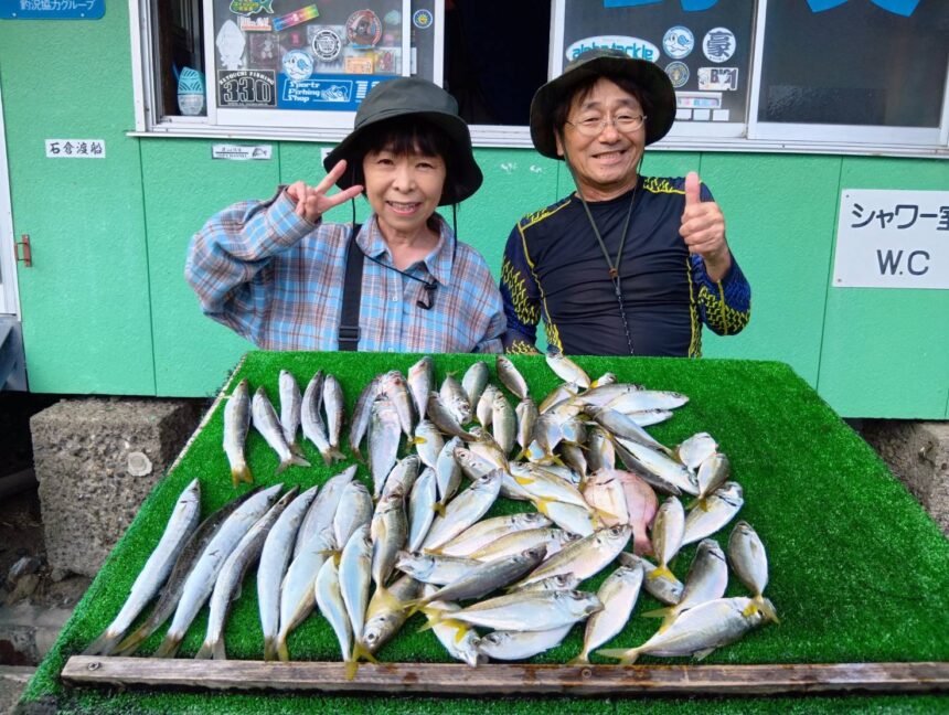 船外機ボートで石島さんがワラサ、オオモンハタ、スミイカをゲット。