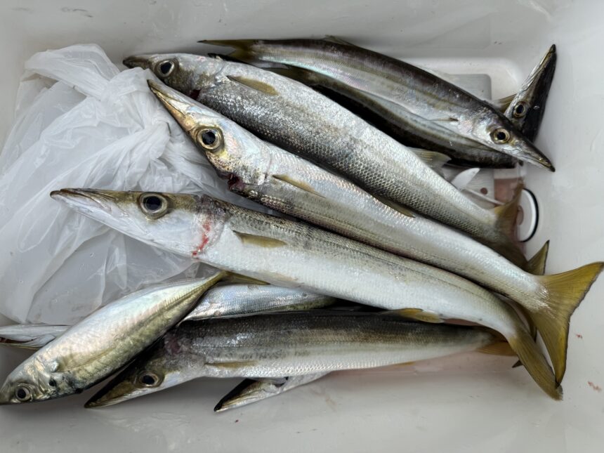 手漕ぎボートで安藤さんがカマス、アジ、サバをゲット。