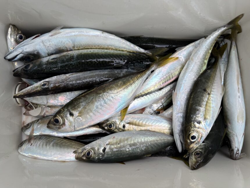 手漕ぎボートで星野さんがアジ、カマス、サバをゲット。