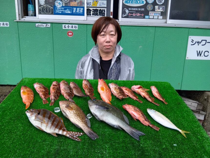 船外機ボートでミコちゃんがグレ、カサゴ、タカノハをゲット。