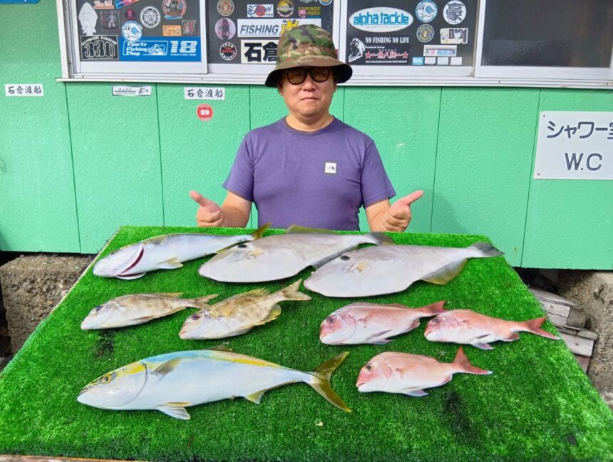 船外機ボートで牧森さんがウスバハギ、ツバス、メイチ、マダイをゲット。