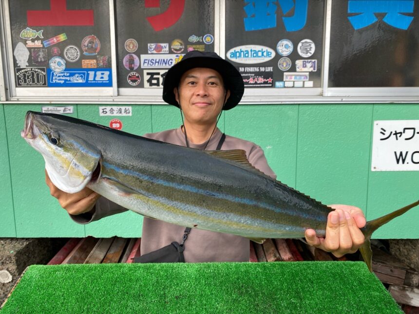 船外機ボートで牧森さんがウスバハギ、ツバス、メイチ、マダイをゲット。