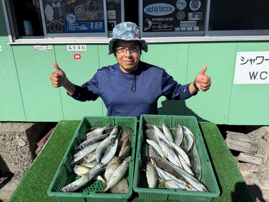 手漕ぎボートで安藤さんがアジ、カマスをゲット。
