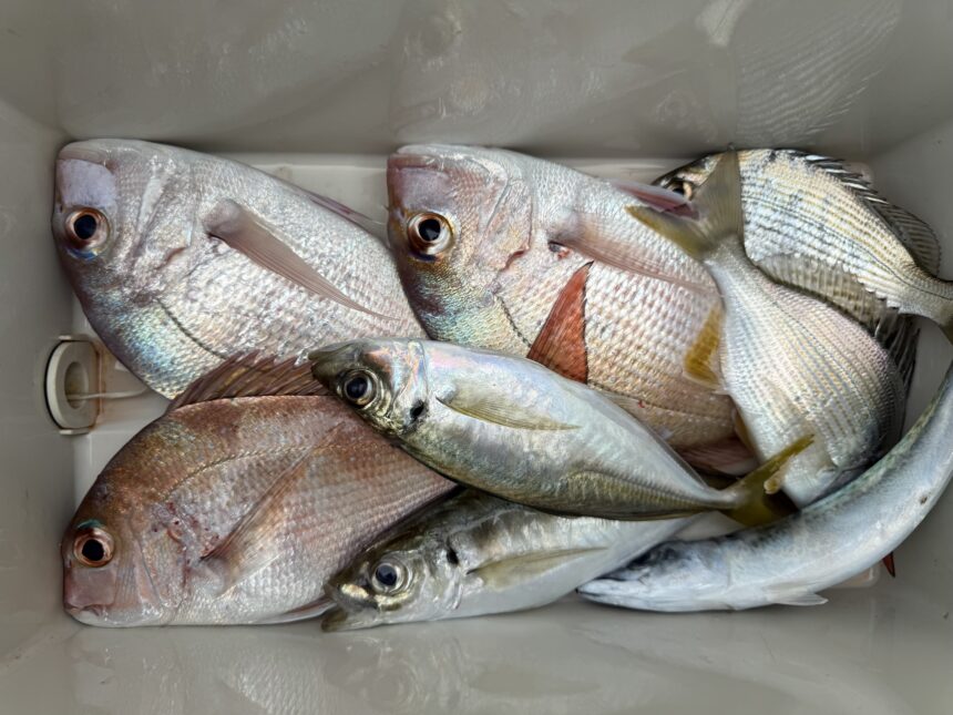船外機ボートで松場さんがマダイ、アジをゲット。