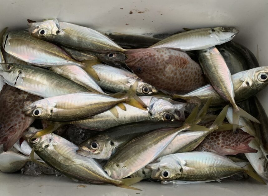 カセ釣りで橋尾さんがアジ、キビレ、シマアジをゲット。