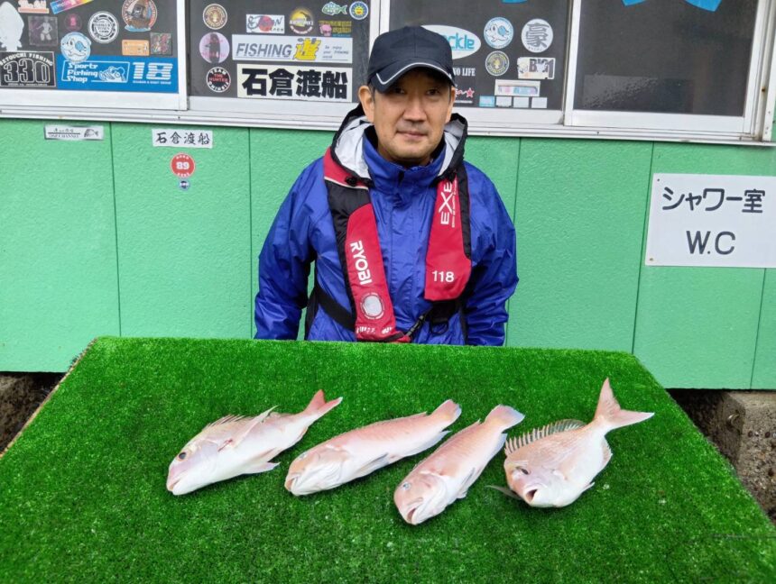 手漕ぎボートで西村さんがマダイ、シロアマダイをゲット。