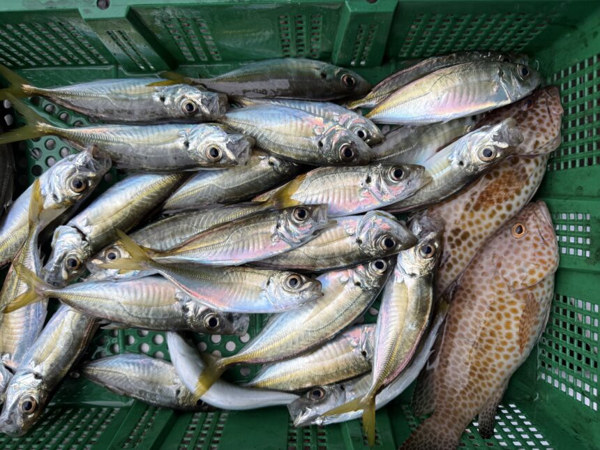手漕ぎボートで田中さんがアジ、オオモンハタをゲット。