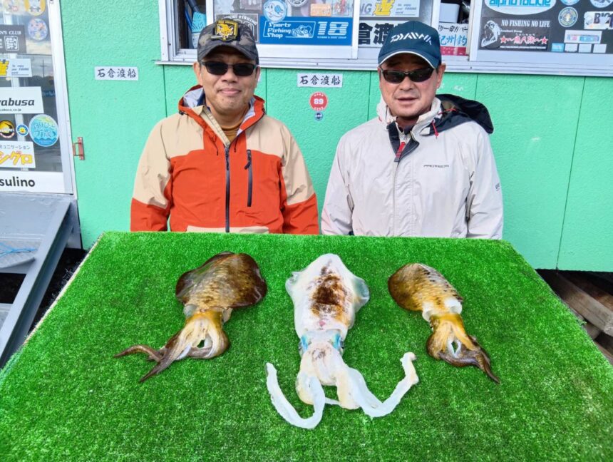 船外機ボートで吉田さんがアオリイカ、ツバスをゲット。