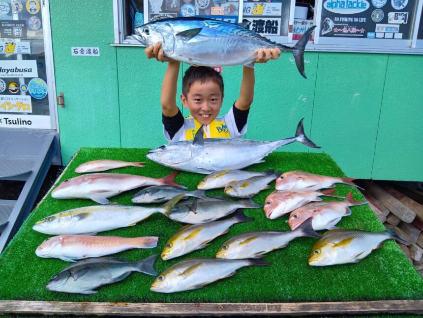 船外機ボートでたいが君がヤイトカツオ、マダイ、ツバス、イサキをゲット。