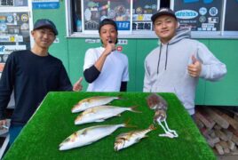 船外機ボートで新本さんがツバス、マダイ、アジ、カワハギをゲット。