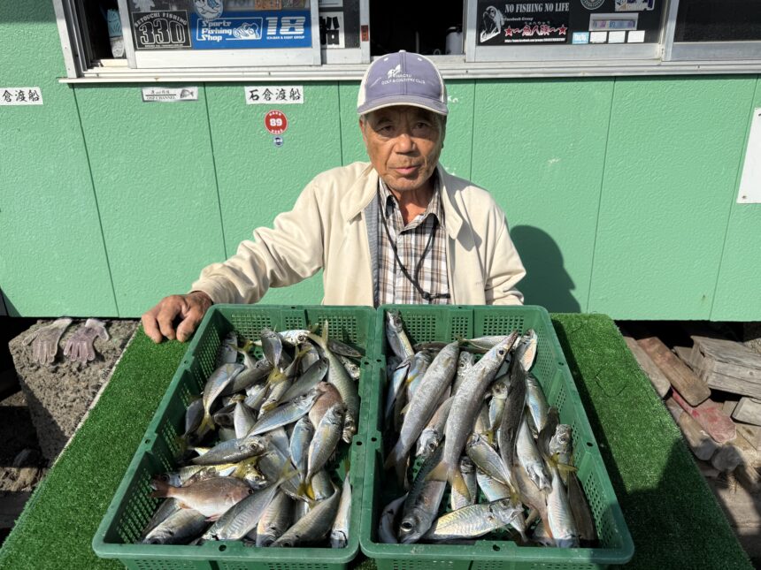 手漕ぎボートで鈴木さんがアジ、カマスをゲット。
