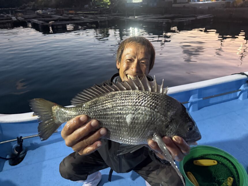 カセ釣りで安藤さんがチヌ44㎝をゲット。