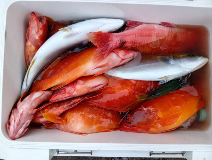 船外機ボートで藤原さんがアカハタ、ツバスをゲット。