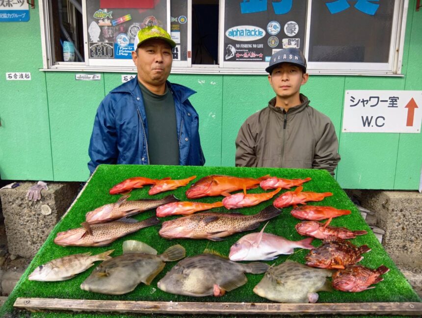 船外機ボートで下霜さんがカワハギ、オオモンハタ、アカハタ、カサゴをゲット。