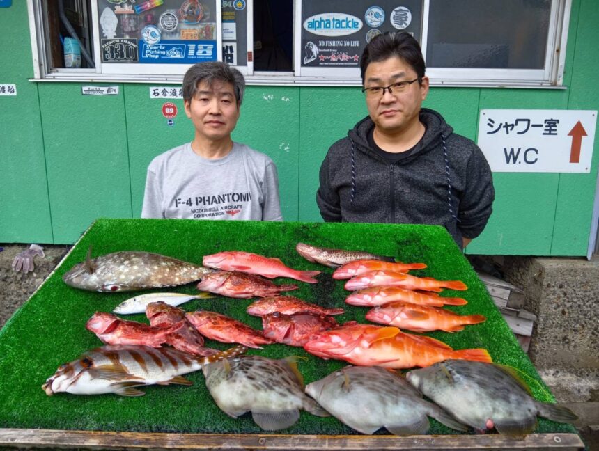 船外機ボートで永尾さんがカワハギ、アカハタ、カサゴ、アイゴ、タカノハをゲット。