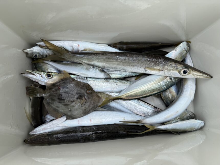 手漕ぎボートで星野さんがアジ、カマスをゲット。