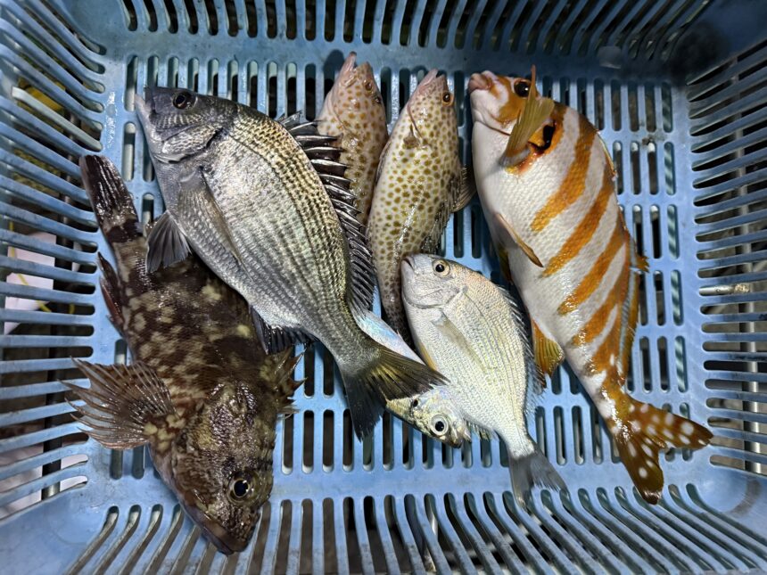 カセ釣りで古田さんがチヌ、カサゴ、タカノハをゲット。