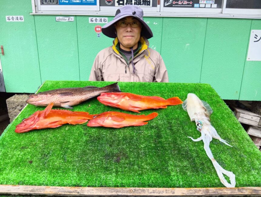 船外機ボートで杉浦さんがオオモンハタ、アカハタ、アオリイカをゲット。