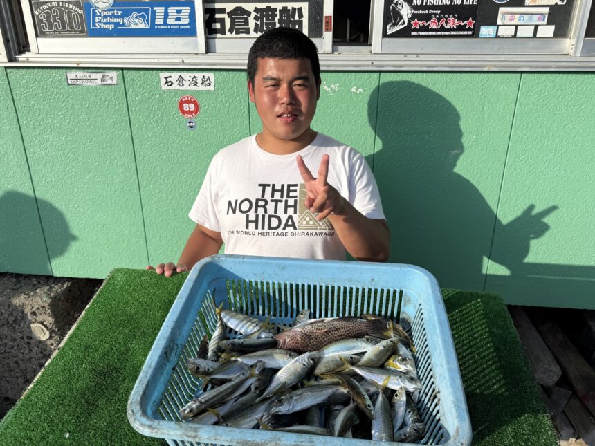 カセ釣りで稲熊さんがアジ、カワハギをゲット。