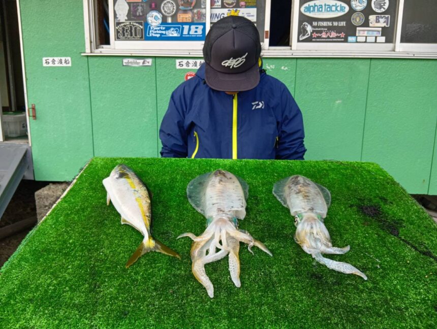 船外機ボートで中森さんがアオリイカ、ツバスをゲット。