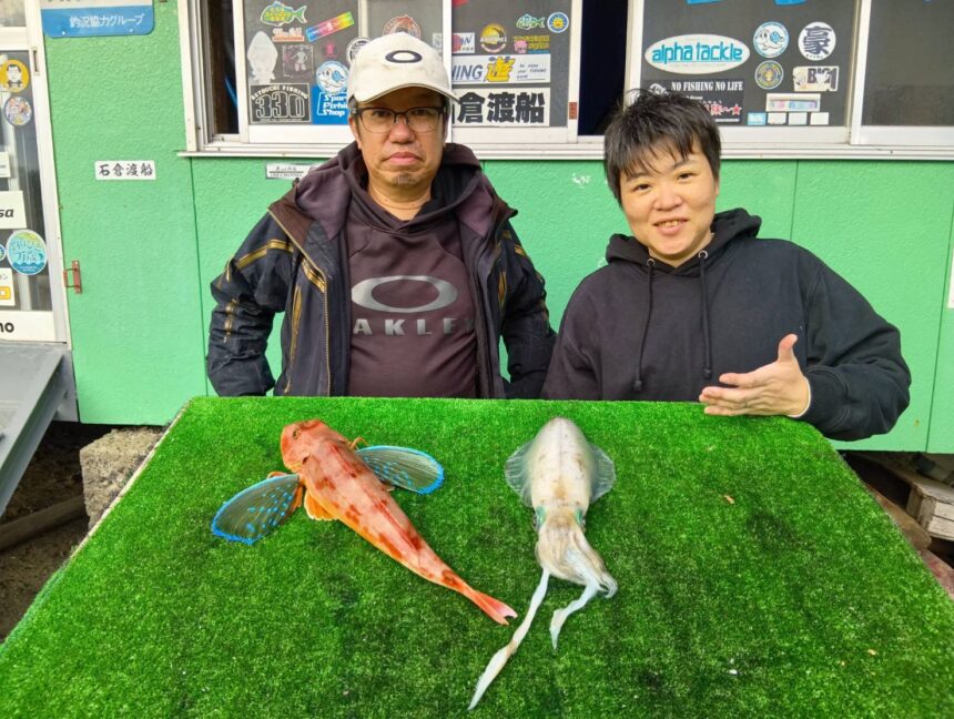 船外機ボートで坂下さんがアオリイカ、ホウボウをゲット。