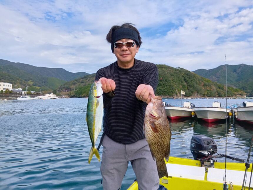 船外機ボートで上田さんがオオモンハタ、ツバスをゲット。